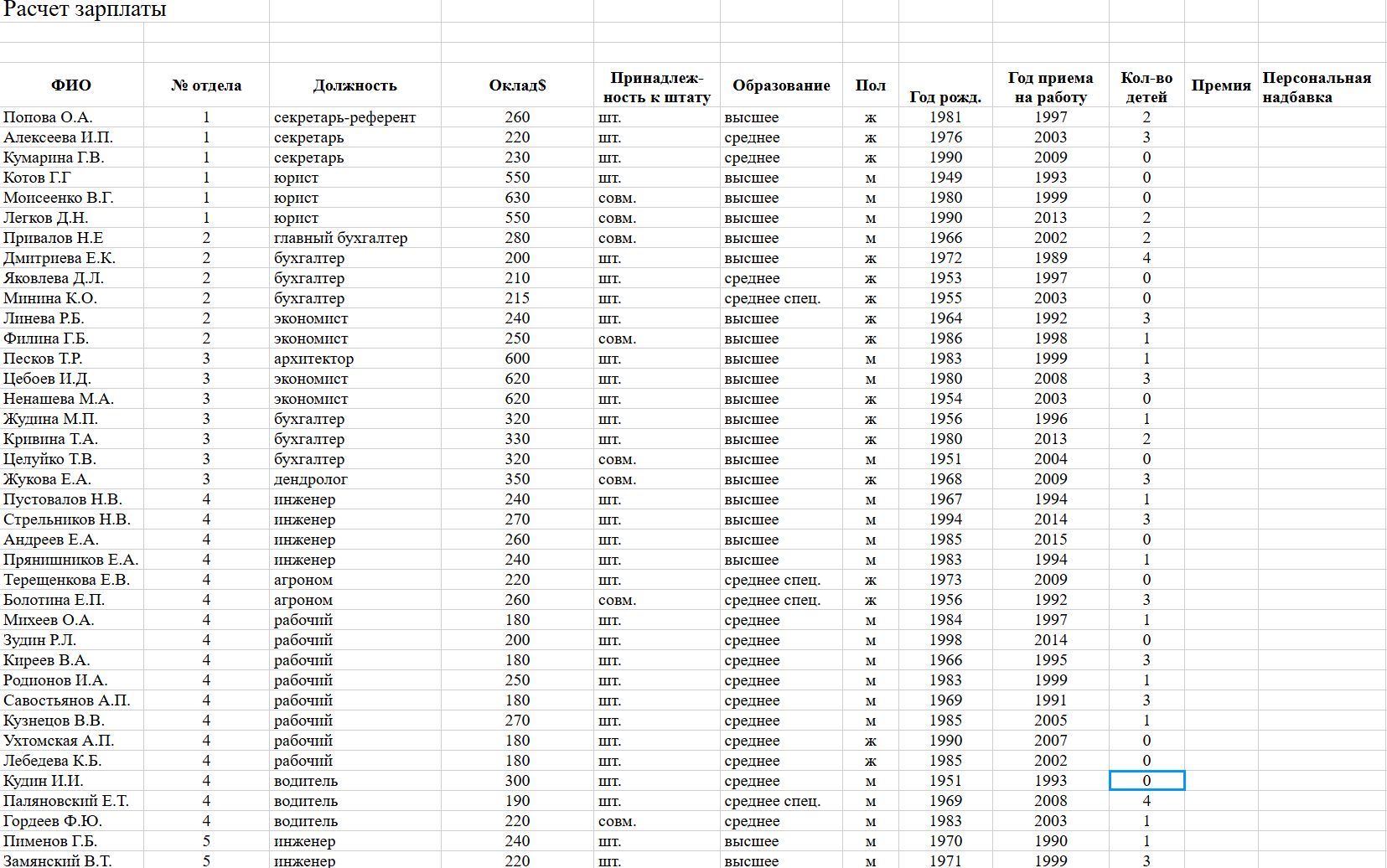 Необходимо выполнить расчетное задание. Файл во вложении. Добавить сумму премии и персональную надбавку по каждому сотруднику. Прописать формулу для расчета.