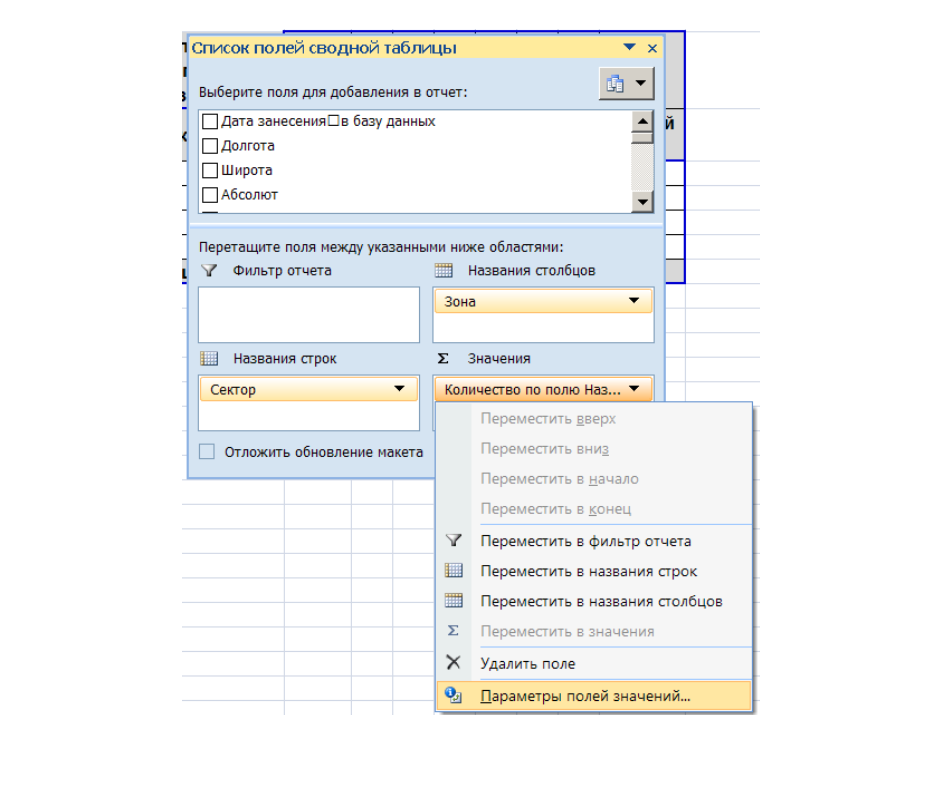 Отразить поля сводной таблицы. Выбрать опцию Параметры полей значений.