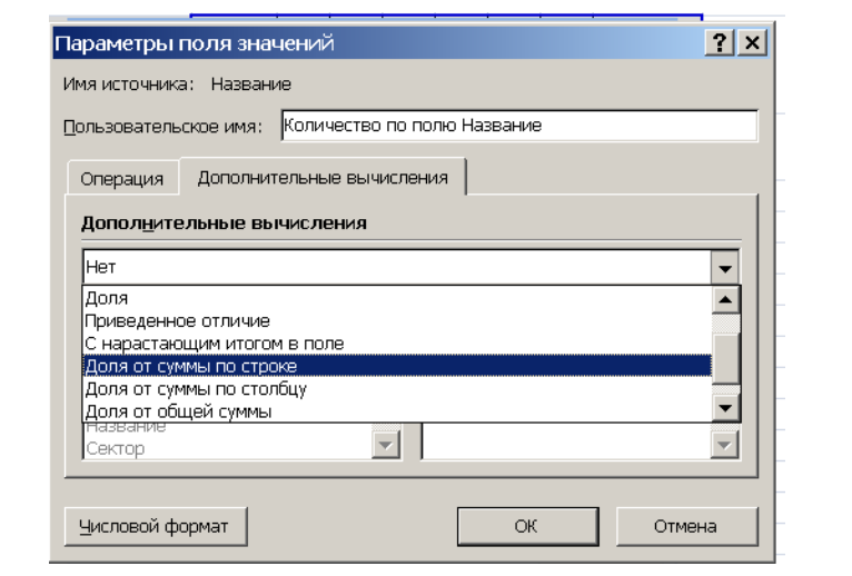 В диалоговом окне Параметры поля значений перейти на вкладку Дополнительные вычисления. Для параметра Дополнительные вычисления выбрать опцию Доля от суммы по строке.