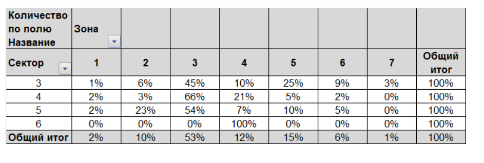 Каждая строка сводной таблицы соответствует одному сектору. Дополнительные вычисления в поле сводной таблицы определяют долю числа станций в зоне в общем числе станций по сектору (Доля по строке). Выполнить: