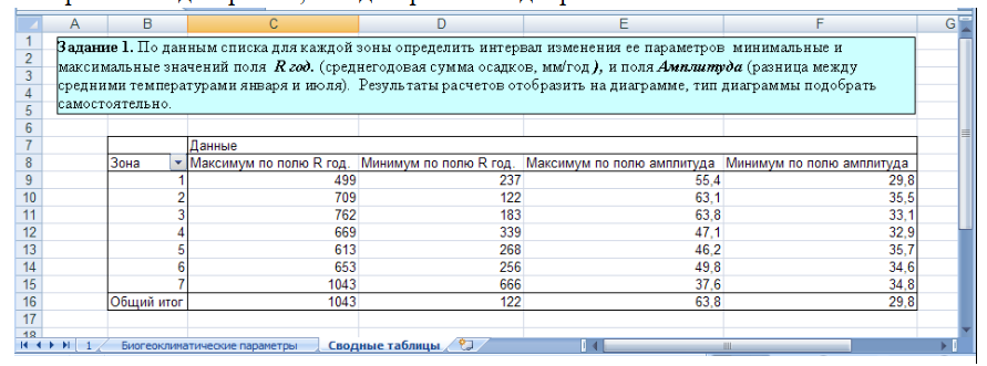 При выполнении заданий использовать функции рабочего листа Сводные таблицы, Группировка. Исходные данные для расчетов – демопример «Биогеоклиматические параметры». Все задания выполнить в одной рабочей книге, все сводные таблицы на одном рабочем листе, определить имя листа - Сводные таблицы. Для каждого решения привести текст задания, которому оно соответствует.