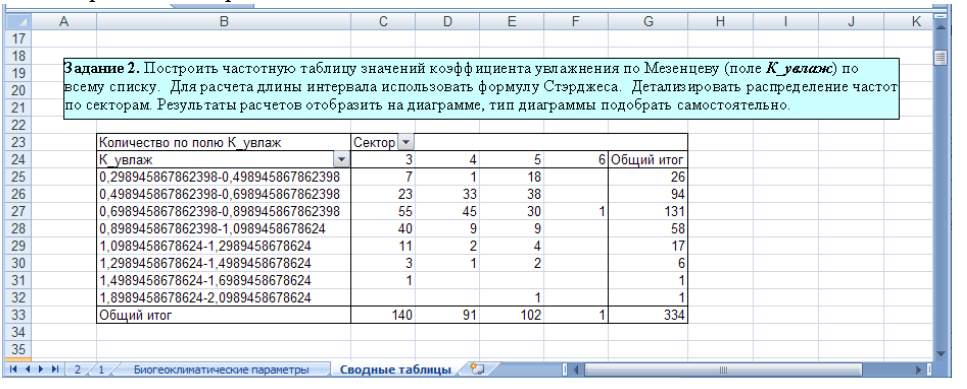 Задание 2. Построить частотную таблицу значений коэффициента увлажнения по Мезенцеву (поле К_увлаж) по всему списку. Для расчета длины интервала использовать формулу Стэрджеса. Детализировать распределение частот по секторам. Результаты расчетов отобразить на диаграмме, тип диаграммы подобрать самостоятельно.