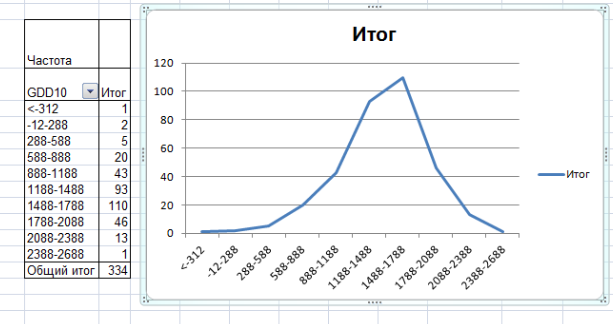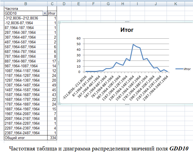 6. Для выявления закономерности вариации значения случайной величины GDD10 рассчитать шаг интервалирования (h) по формуле Стерджеса: