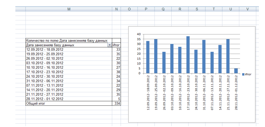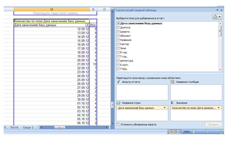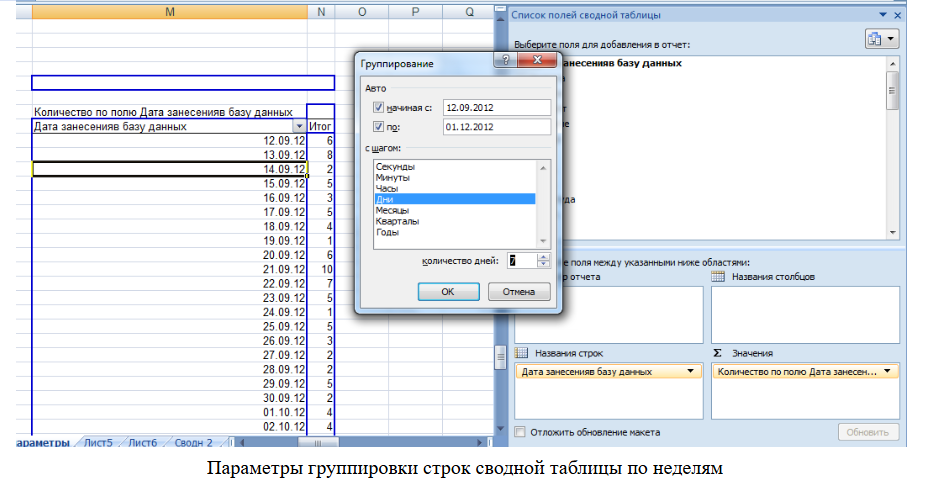 2. Установить курсор в область сводной таблицы на любое значение поля Количество по полю Дата занесения в базу данных. Вызвать функцию Группировать.