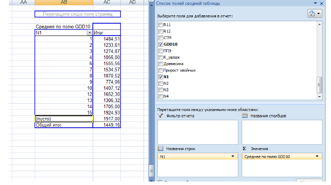 поле GDD10 перенести в область Значения, определить для него итоговую функцию – Среднее.