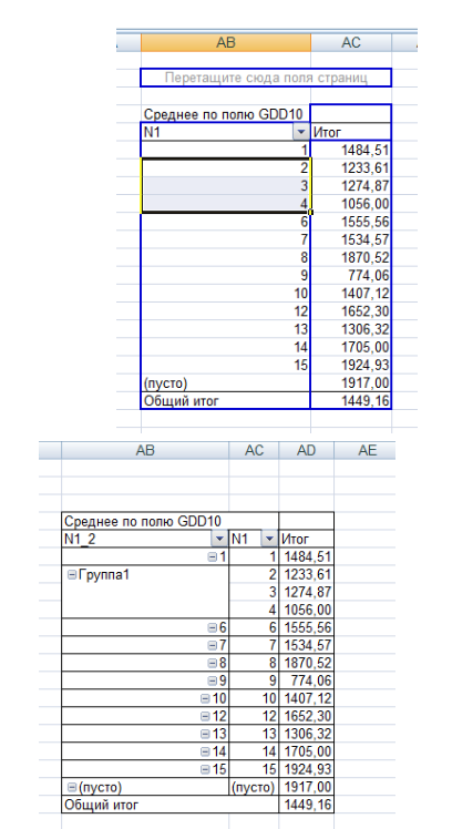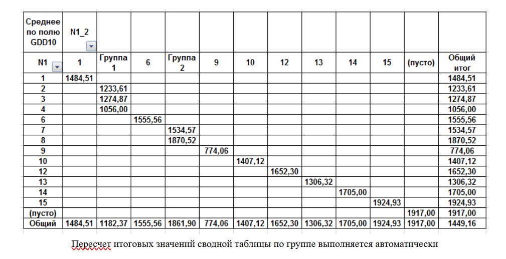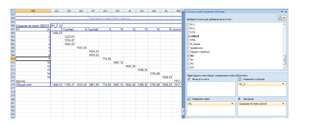4. Для просмотра средних значений по созданным группам преобразовать структуру сводной таблицы – поле N1_2 перенести из области Названия строк в область Названия столбцов.