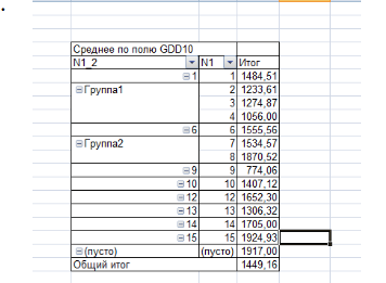1. Создать копию листа Биогеоклиматические параметры. Новому листу присвоить имя Групп 1. Построить сводную таблицу, структура таблицы: - поле GDD10 «отбуксировать» в область Названия строк; - поле GDD10 – в область Значения.