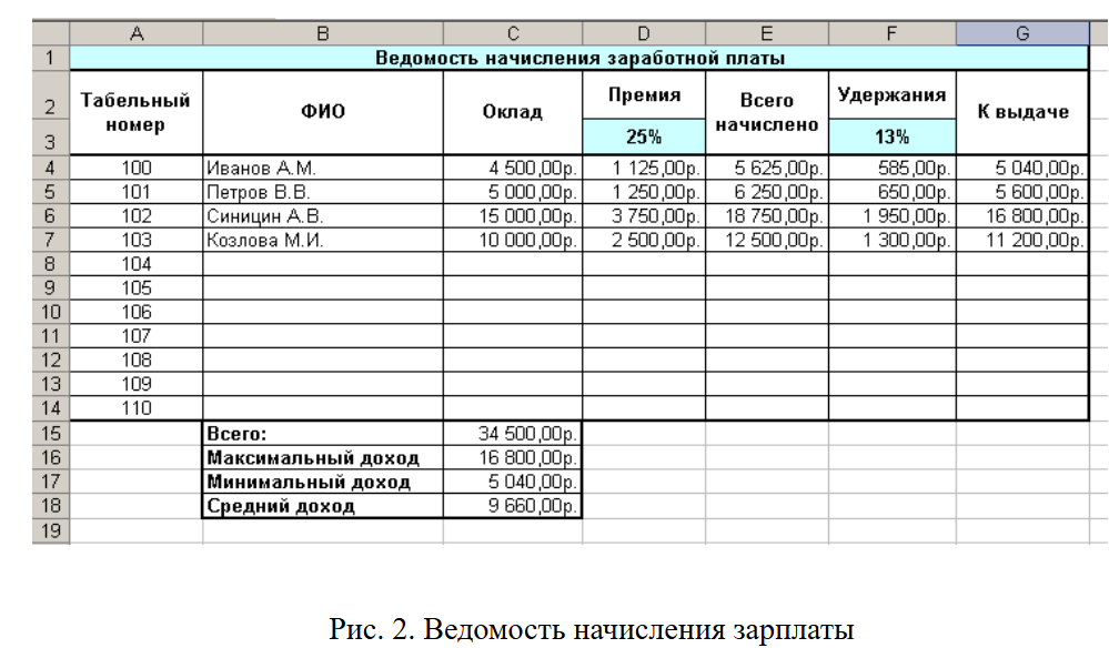 2. Создать и оформить таблицу расчета заработной платы, как показано на рис. 2, и заполнить произвольными данными столбцы В (ФИО) и С4:С14 (Оклад), не менее 10 строк.