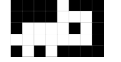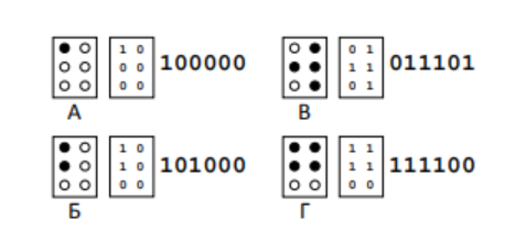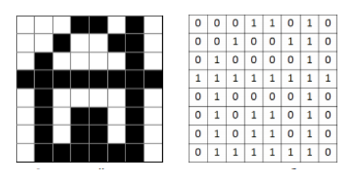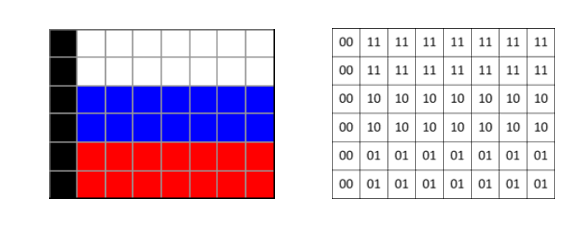 Что делать, если рисунок цветной? В этом случае для кодирования цвета пикселя уже не обойтись одним битом. Например, в показанном на рисунке изображении российского флага 4 цвета: черный, синий, красный и белый. Для кодирования одного из четырех вариантов нужно 2 бита, поэтому код каждого цвета (и код каждого пикселя) будет состоять из двух бит. Пусть 00 обозначает черный цвет, 01 – красный, 10 – синий и 11 – белый. Тогда получаем такую таблицу: