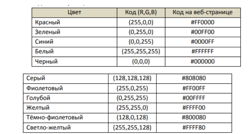 При кодировании цвета на веб‐страницах также используется модель RGB, но яркости каналов записываются в шестнадцатеричной системе счисления (от 0016 до FF16), а перед кодом цвета ставится знак #. Например, код красного цвета записывается как #FF0000, а код синего – как #0000FF. Вот коды некоторых цветов: