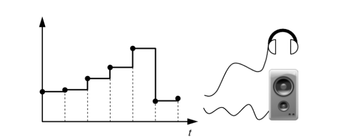 Для кодирования звука в компьютерах чаще всего используются частоты дискретизации 8 кГц (плохое качество, но достаточно для распознавания речи), 11 кГц, 22 кГц, 44,1 кГц (звуковые компакт‐диски), 48 кГц (фильмы в формате DVD), а также 96 кГц и 192 кГц (высококачественный звук в формате DVD‐audio). Выбранная частота влияет на качество цифрового звука. Дело в том, что наушники и звуковые колонки – это аналоговые (не цифровые) устройства, и при проигрывании звука через звуковую карту компьютеру нужно как‐то восстановить исходный аналоговый сигнал и передать его на наушники или звуковые колонки. В памяти есть только отсчеты, снятые с интервалом T, остальная информация была потеряна при кодировании. В простейшем случае по ним можно восстановить ступенчатый сигнал, который будет существенно отличаться от исходного (до кодирования).