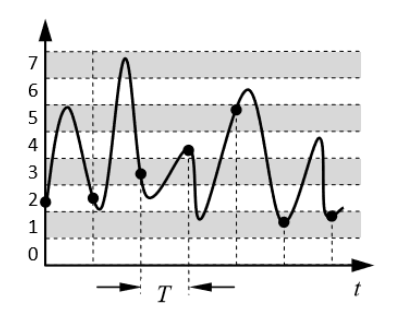 Ситуация напоминает ту, с которой мы столкнулись при кодировании рисунка – любая линия состоит из бесконечного числа точек, поэтому чтобы закодировать «по точкам» нужна бесконечная память. Здесь тоже придется использовать дискретизацию – представить аналоговый сигнал в виде набора чисел, то есть записать в память только значения сигнала в отдельных точках, взятых с некоторым шагом T по времени.