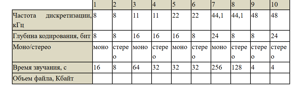Заполните пустые клетки таблицы, вычислив объем звукового файла (без сжатия):