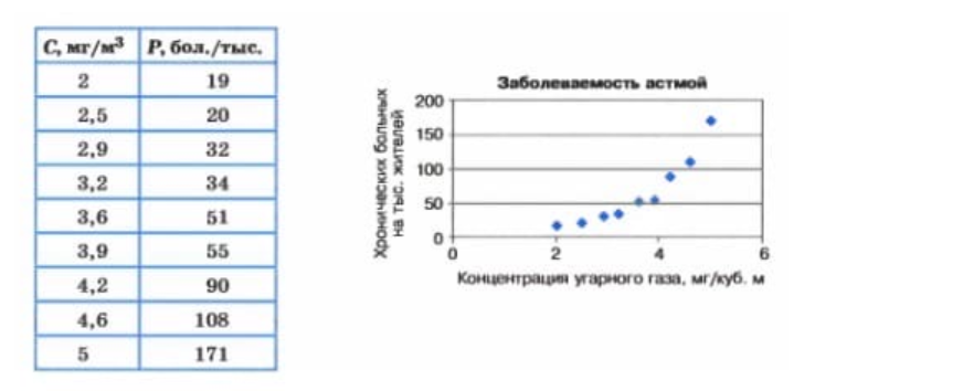 1. Ввест табличные данные зависимости заболеваемости бронхиальной астмой от концентрации угарного газа в атмосфере (см. рисунок)