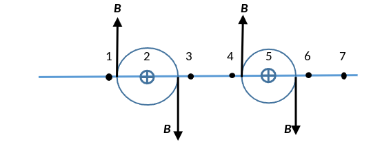 Задача 1. Два длинных прямых проводника с токами расположены в пространстве так, как показано на рис. Токи в проводниках текут в одном направлении. В каких точках, указанных на рисунке, направление векторов индукции магнитных полей, созданных этими токами, совпадают? В ответе указать номера точек в порядке возрастания и обосновать.