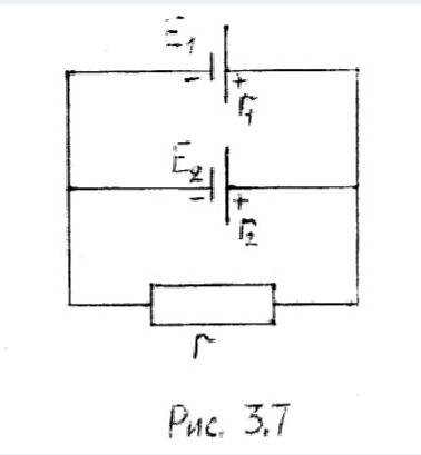 Определить силу тока в каждом элементе и напряжение на зажимах реостата (рис. 3.7), если Е1 = 12В, Е2 = 6В, r1 = 1 Ом, r2 = 1,5 Ом и r = 20 Ом