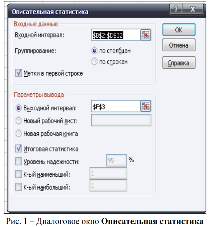 2. Вызовите диалоговое окно Анализ данных – Описательная статистика и нажмите кнопку ОК.