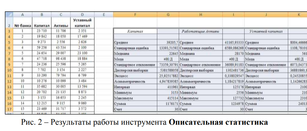 Вычислите основные показатели описательной статистики для приведенного в таблице 1 списка банков и выполните группировку банков по уставному капиталу с помощью Пакета анализа.