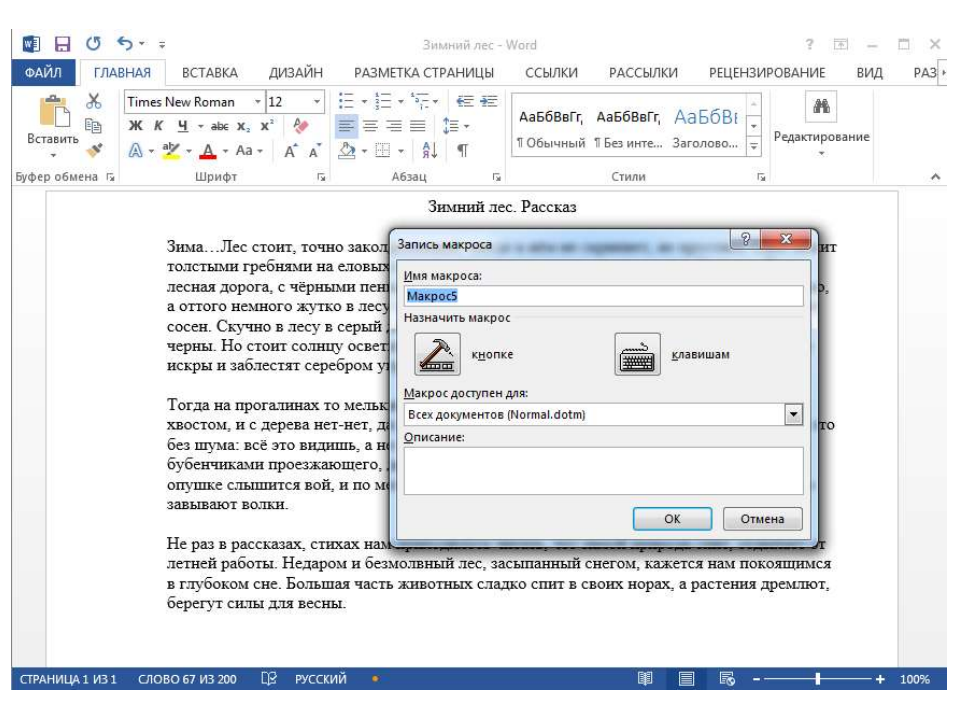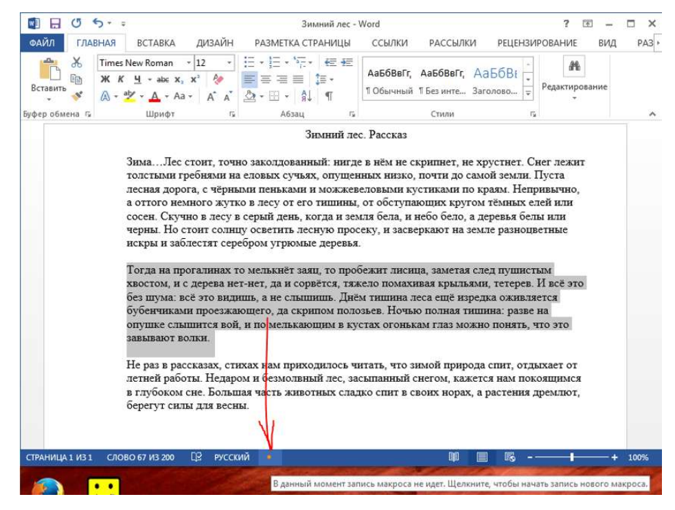 Выделим часть текста и нажмем кнопку «Запись макроса», которая находится в нижней части окна Word