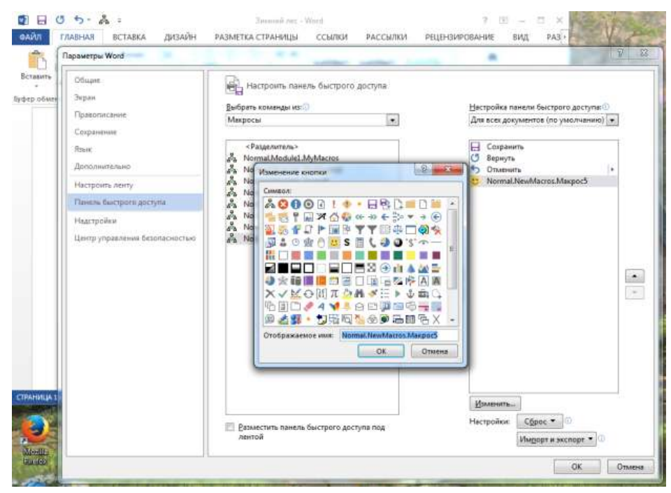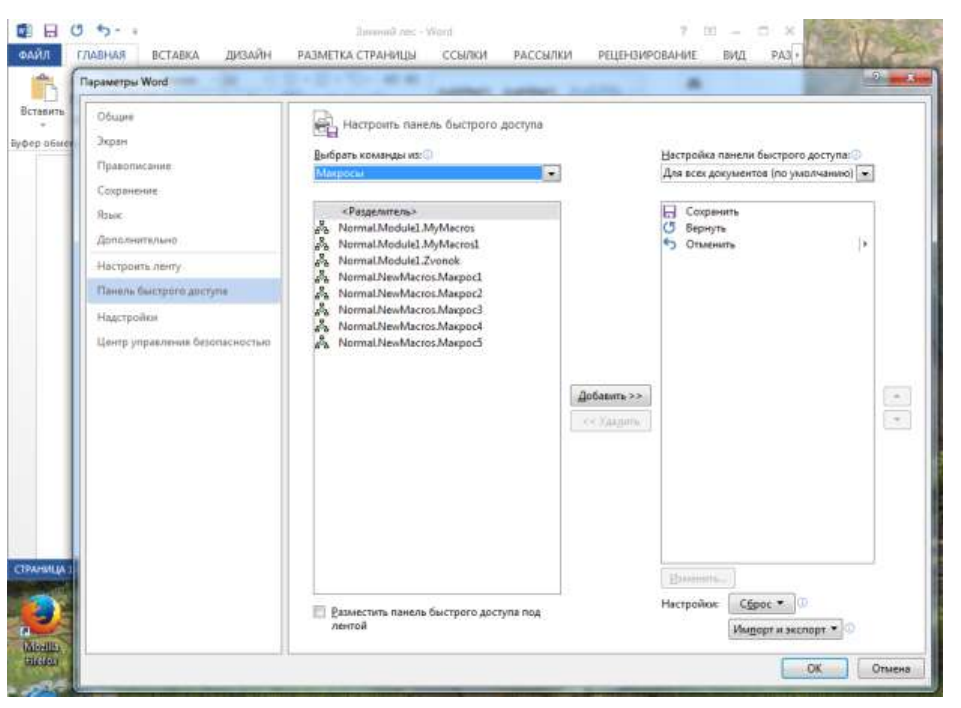 Для удобства использования записанного макроса добавим кнопку на панель быстрого доступа. Для этого выберем в меню «Файл», «Параметры», «Панель быстрого доступа». В списке «Выбрать команды из» выбираем «Макросы» и сам записанный макрос (в данном случае это Макрос5).