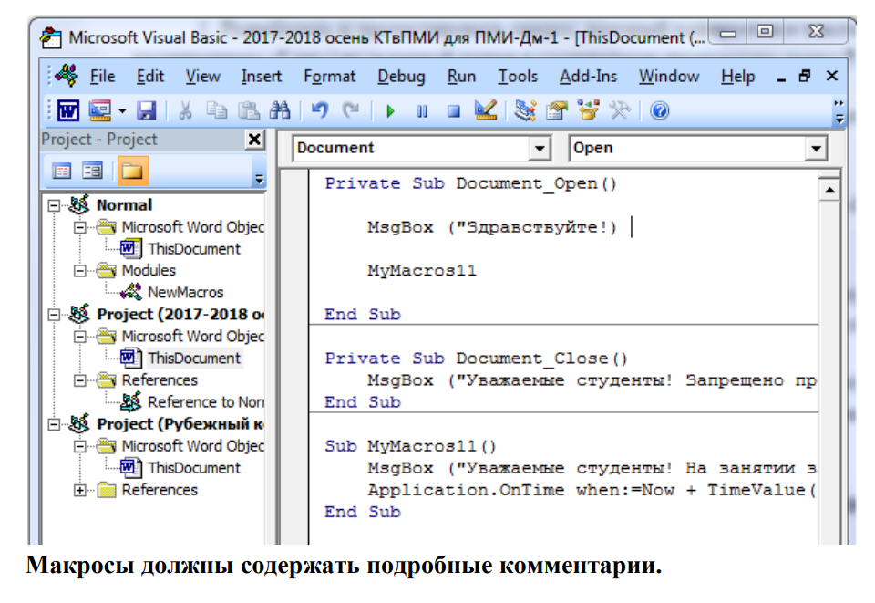 Word-файл содержит скриншоты окна редактора кода (должен быть виден объект, в котором находится макрос) с разработанными (согласно номеру варианта) макросами, например: