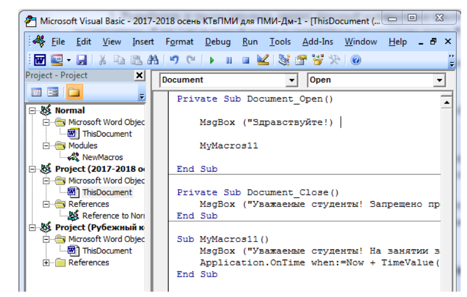 Word-файл содержит скриншоты окна редактора кода (должен быть виден объект, в котором находится макрос) с разработанными (согласно номеру варианта) макросами, например: