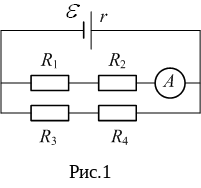 2. На схеме, изображенной на рисунке 1, ЭДС источника ε=95 В, внутреннее сопротивление r=0,5 Ом. Сопротивления внешней цепи R1=R3=6 Ом, R2=R4=12 Ом. Показание амперметра равно … А.