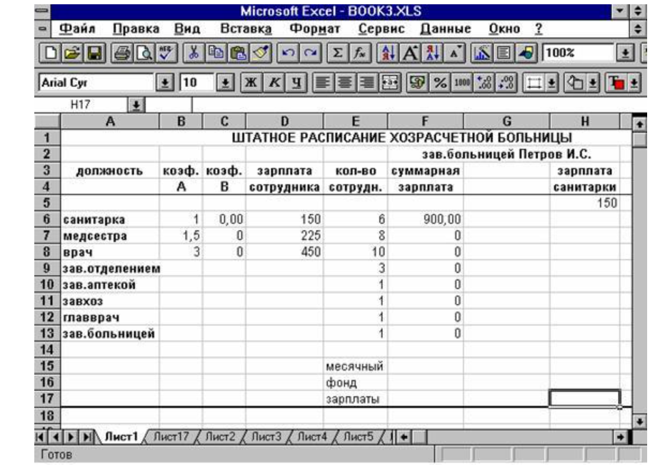Постановка задачи: заведующий хозрасчетной больницей должен составить штатное расписание, т.е. определить, сколько сотрудников, на каких должностях и с каким окладом он должен принять на работу. Общий месячный фонд зарплаты составляет $10000.