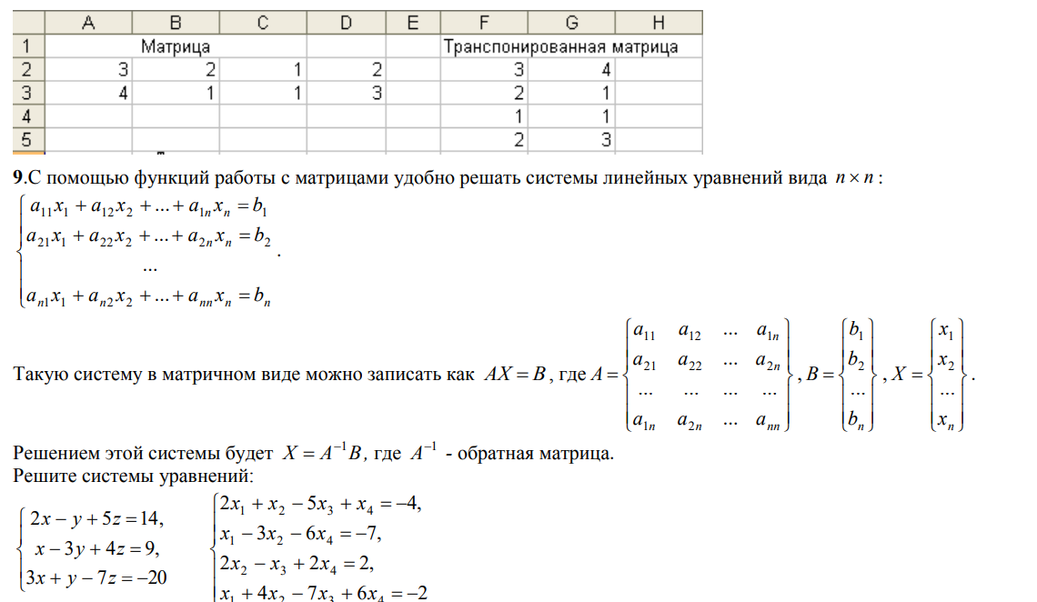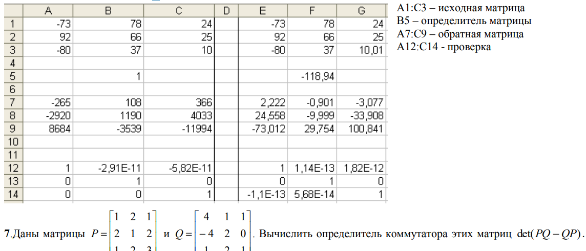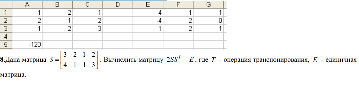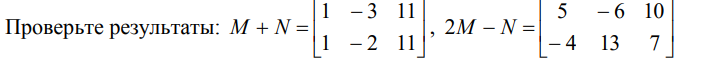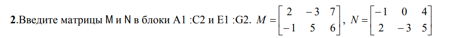 4.Вычислите линейную комбинацию матриц 2М- N в блоке А7:С8.