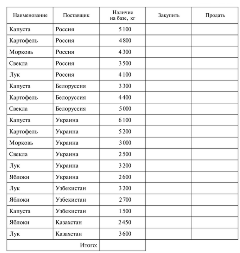 в столбец «Закупить» ввести формулы, которые позволят получить в ячейках столбца знак «+», если продукт поставлен из России и при этом его наличие на базе меньше 4 000 кг, в противном случае должен быть получен «-».