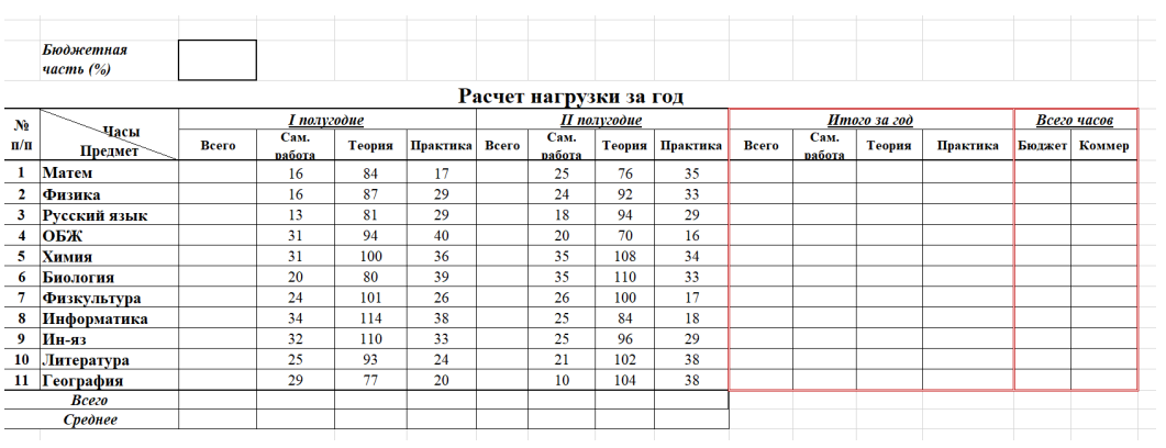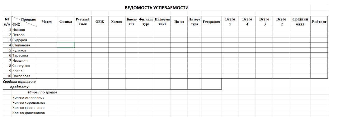 6. Заполнить данные оценок по предметам, ввести формулы расчета по остальным столбцам таблицы, используя различные функции (СРЗНАЧ, СЧЕТЕСЛИ и т.д.).