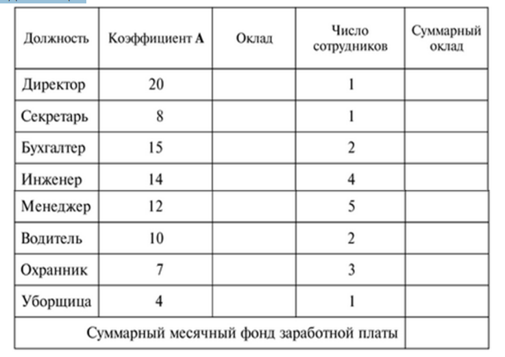 • Вычислить оклад для каждой должности, суммарный оклад для каждой должности, суммарный месячный фонд заработной платы. Для С и В предусмотреть отдельные ячейки.