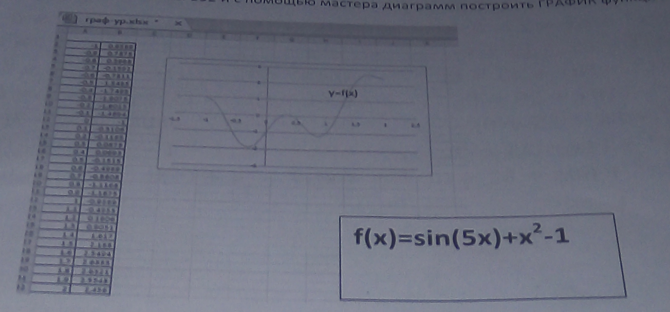 А ячейке В2 ввести формулу =SIN(5*A2)+A2^2-1, остальные ячейки заполнить с помощью маркера заполнителя.