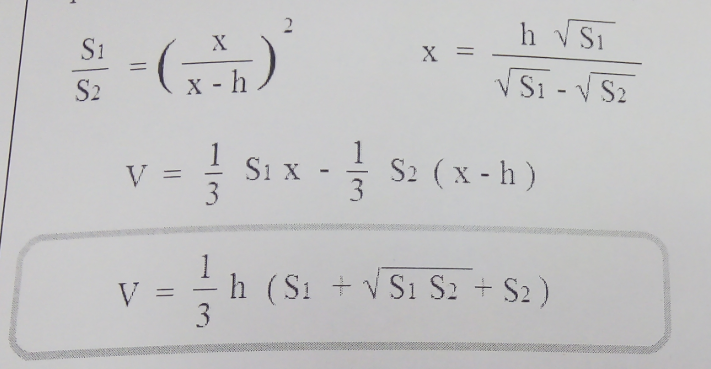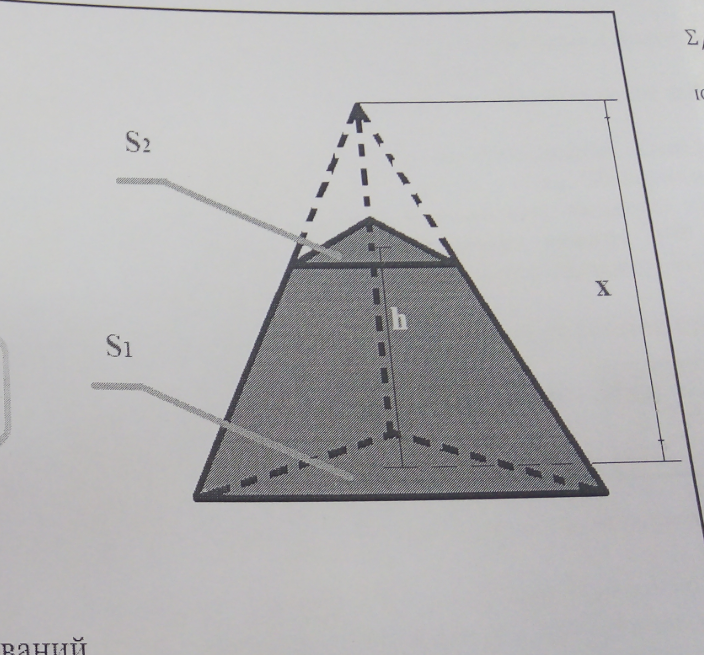 где V - объём пирамиды x - высота полной пирамиды h - высота усечённной пирамиды S1 S2 - площади нижнего и верхнего оснований |