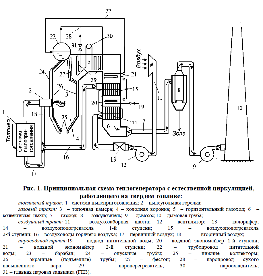 Определить расчетный расход топлива, подаваемого в топочную камеру парового теплогенератора (котлоагрегата), работающего на твердом топливе (рис. 1). Вид топлива, объемы продуктов сгорания и воздуха, производительность теплогенератора и другие данные для расчета берутся из табл. 1, 2 для каждого варианта по последней и предпоследней цифрам шифра.