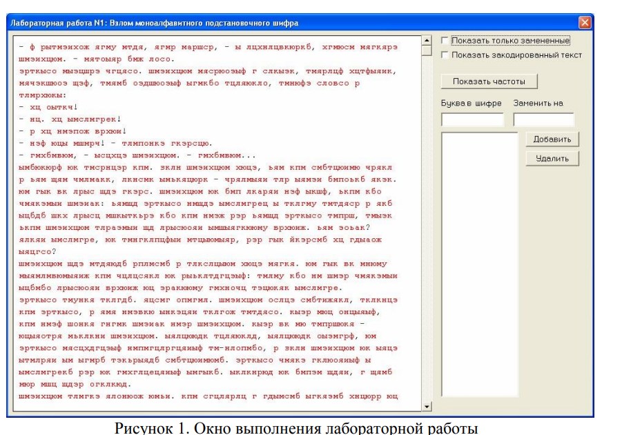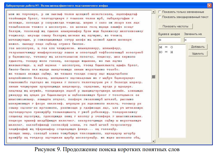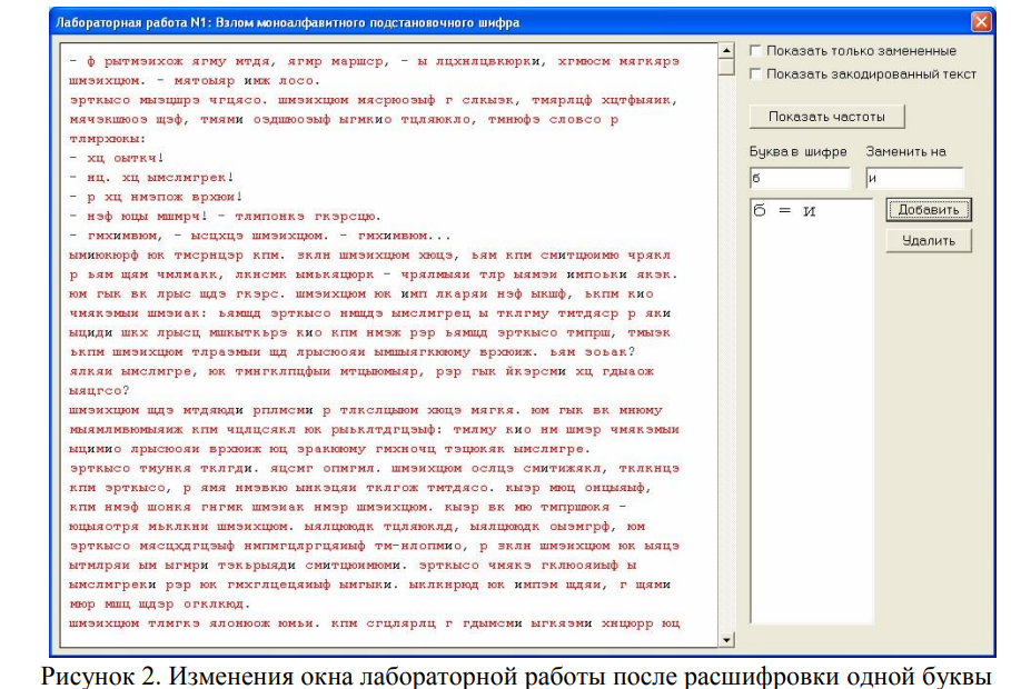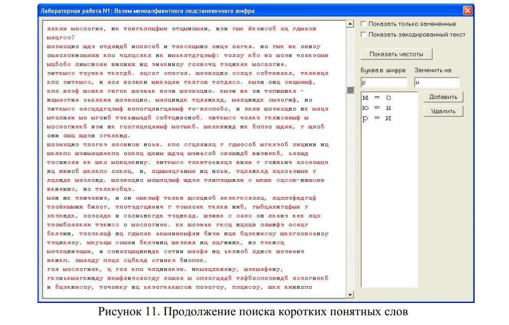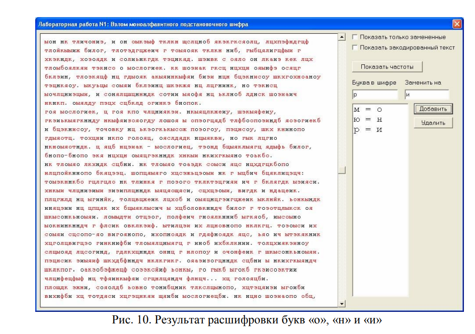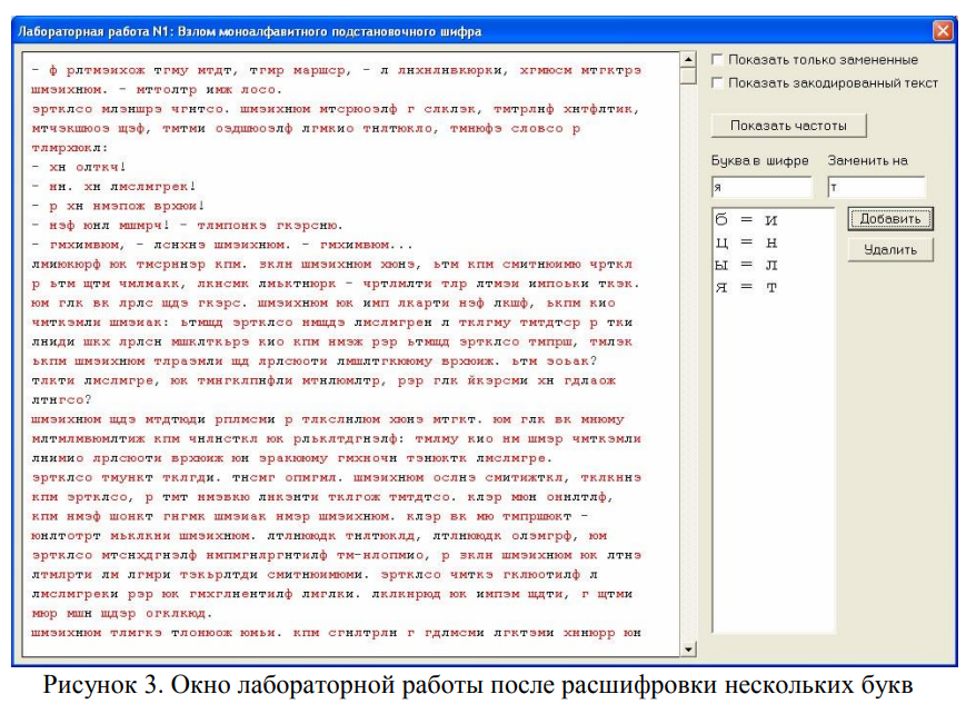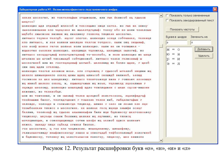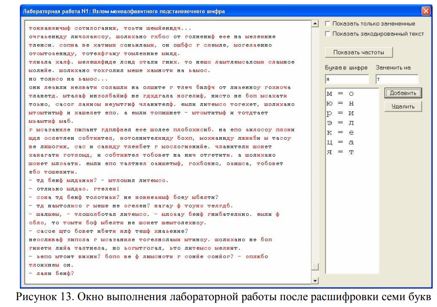 После расшифровки аналогичным образом букв «к» на «е», «ц» на «а» и «я» на «т» окно выполнения лабораторной работы приобретает следующий вид (рис. 13):