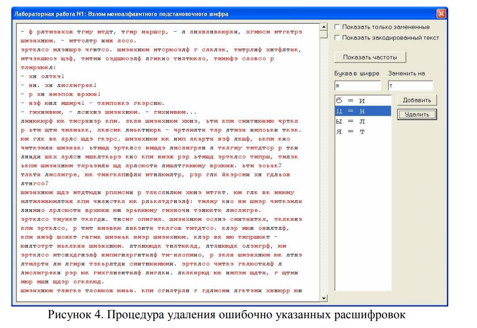 Чтобы отменить указанную расшифровку буквы, нужно в списке расшифровок мышкой указать соответствующую пару букв и нажать кнопку «Удалить» (рис. 4). Полоса вертикального скроллинга служит для навигации по расшифровываемому тексту.