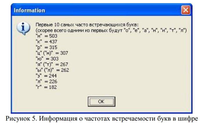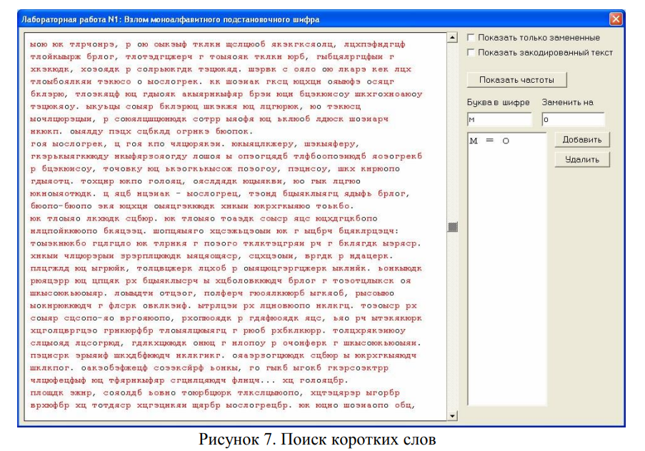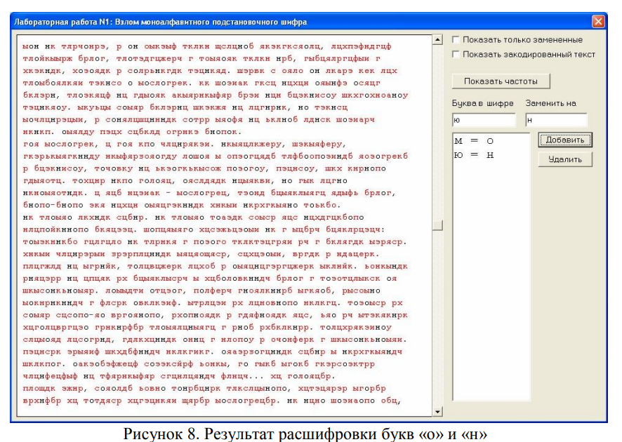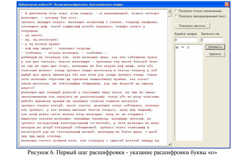 Первым шагом в расшифровке текста может быть указание расшифровки для самой часто встречаемой буквы - буквы «о». Для случая, приведенного на рис. 5, указывается «о» как расшифровка буквы «м» шифра (см. рис. 6).