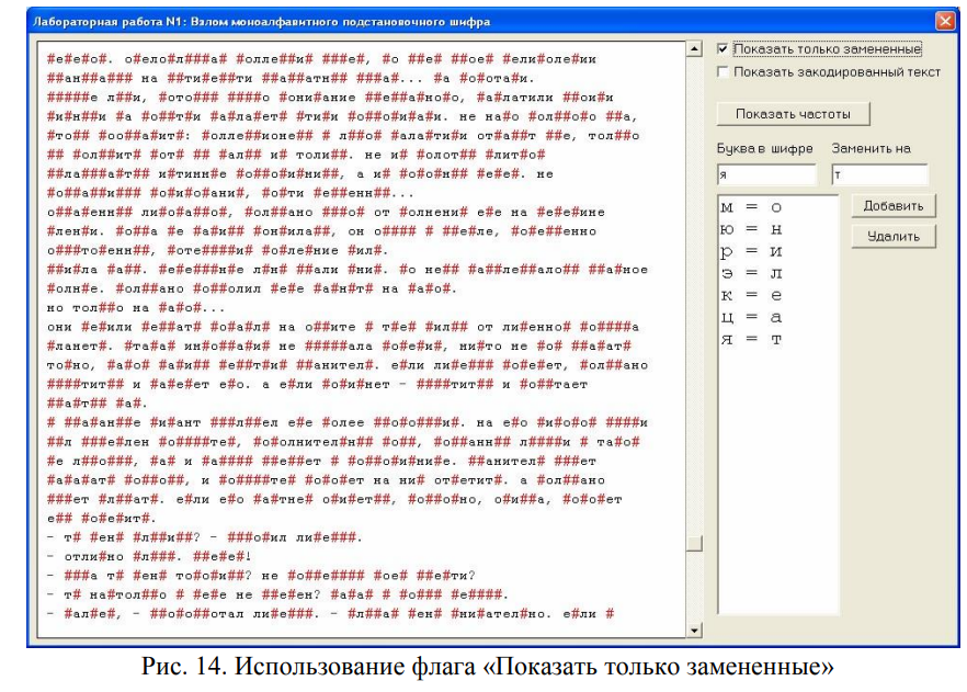 Когда так много букв уже известно, зашифрованные буквы могут мешать для понимания слов. Для облегчения дальнейшего анализа в программе предусмотрена возможность выставления флага «Показать только замененные», при выставлении которого все зашифрованные буквы выводятся на экран в виде символов решетки (рис. 14).