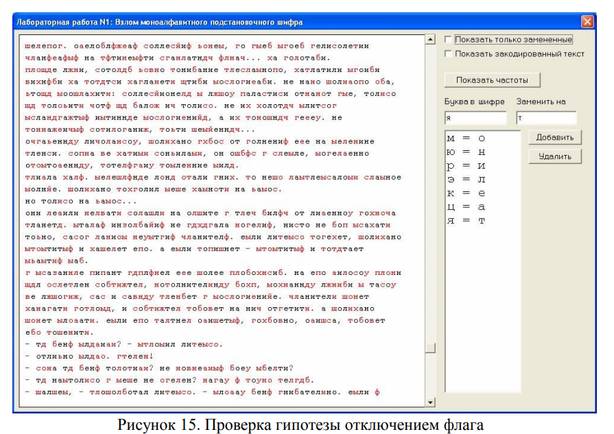 Теперь видно, что слово «##о#о##отал» в нижней строке вполне может быть словом «пробормотал». Если теперь выключить флаг, то можно получить косвенное подтверждение этого - на позициях двух букв «р» в этом слове в шифре также находится одинаковая буква «л» (рис. 15).