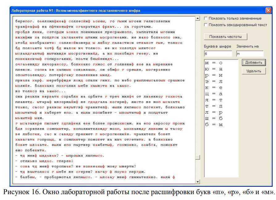 Если заменить теперь букву «т» на «п», «л» на «р», «ш» на «б» и «б» на «м», то окно выполнения лабораторной работы станет выглядеть так(рис. 16):