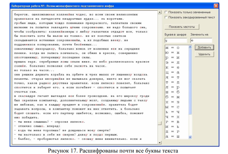 Хорошо видно, что дальнейший анализ значительно упрощается. Например, очевидно по слову «хаплатили», что буква «х» шифра соответствует букве «з» исходного текста. На рис. 17 приведено окно программы, когда анализ уже близок к завершению (осталось совсем немного нерасшифрованных букв).