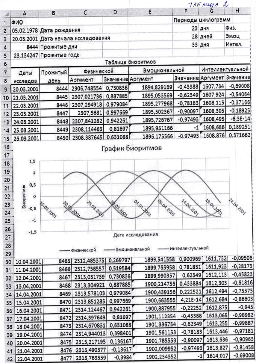 В результате исследований было выявлено, что функции физической активности, эмоционального состояния, и умственных способностей человека являются периолическими с периодами 23 ня (Ф), 28 дней (Э) и 33 дня (И).
