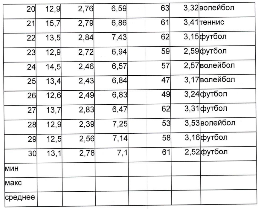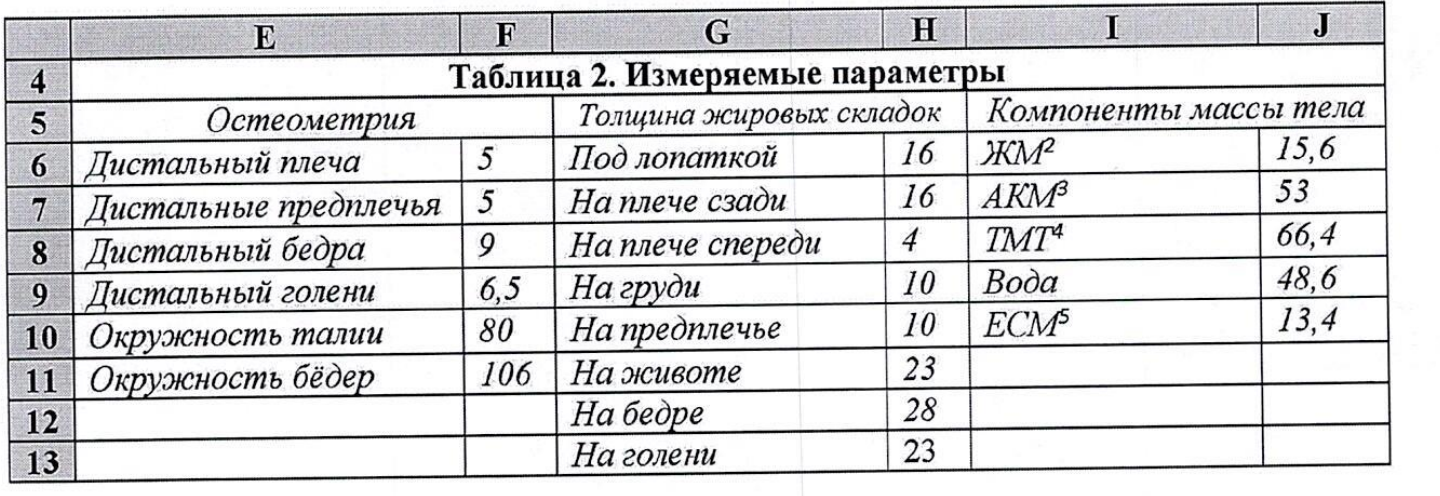 2. Построить таблицу 2 с исходными данными "Измеряемые параметры". Таблица содержит данные, полученные при обследовании пациента.