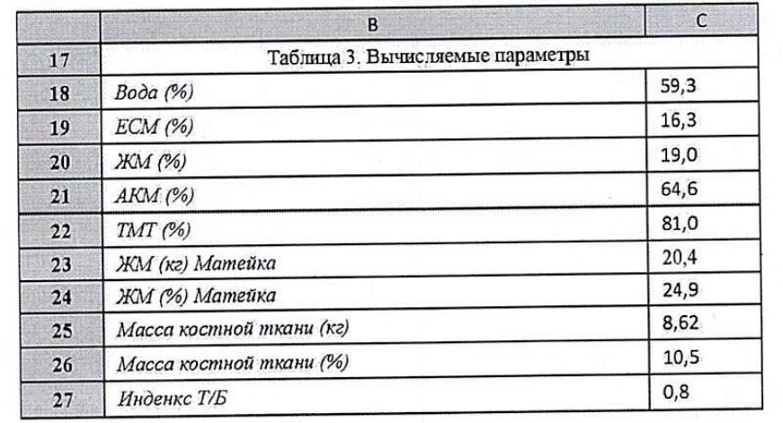 Параметры Вода(%), ЕСМ(%), ЖМ (%), АКМ (%), ТМТ (%), ЖМ (%) Матейка, Масса костной ткани (%) вычисляются как процентное соотношение между массой тела и одним из измерённых параметров (например, жировой массой).