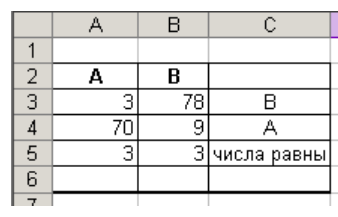 Итак, в ячейке С3 формула: =ЕСЛИ(A3 > B3; “A” ;”B”) Обратите внимание!! - значение аргумента это текст, поэтому используют кавычки.