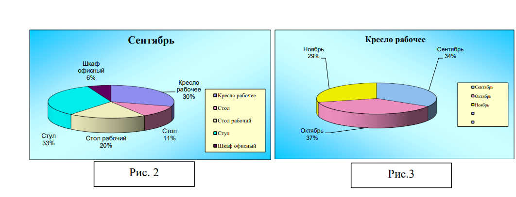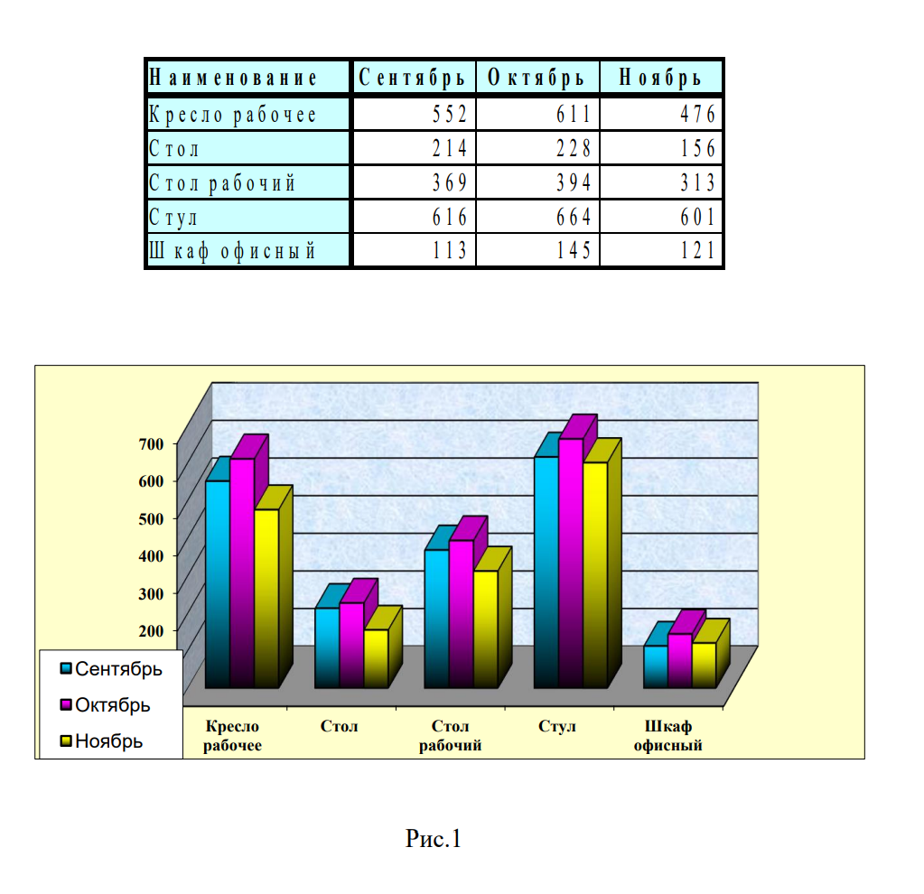 Для начала создайте таблицу Динамика продаж офисной мебели Теперь создадим объемную столбчатую диаграмму (гистограмму) по всей таблице, как на Рис.1.