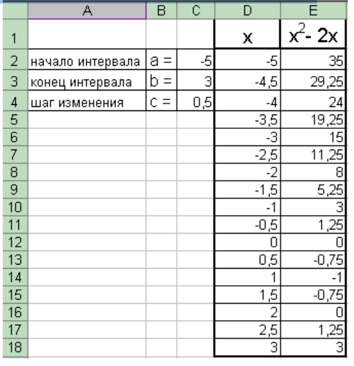 6. В ячейке E2 должна быть формула = D2^2 – 2*D2