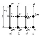 1.5 Физический маятник представляет собой тонкий однородный стержень массой m с укрепленным на нем двумя маленькими шариками массами m и 2m. Маятник совершает колебания около горизонтальной оси, проходящей через точку O на стержне. Определите период гармонических колебаний маятника для случая в. Длина стержня l=100см. Шарики рассматривать как материальные точки.