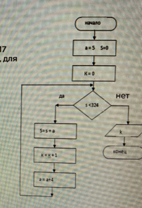 Дана последовательность 5, 9, 13, 17. Составьте блок-схему алгоритма, для подсчёта числа слагаемых, сумма которых равна 324.